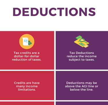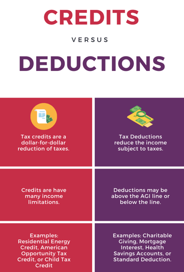 Tax deductions and tax credits both reduce your tax bill, but they work differently: